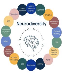A neurodivergent person has a brain that functions differently from what is considered “typical.” This includes both neurodevelopmental and mental health conditions. Examples include: